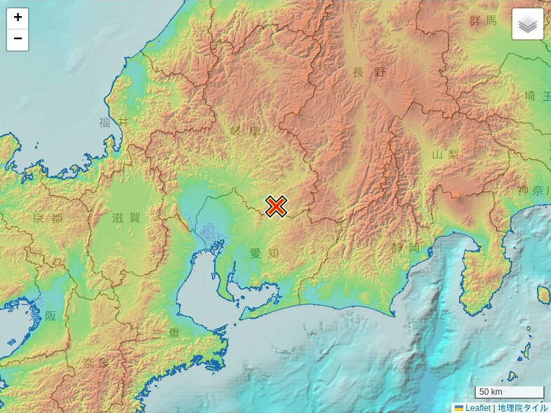 2023年9月9日 11:28ごろ岐阜県美濃東部(深さ約50km)を震源とする震度1の地震がありました。この地震による津波の心配はありません。