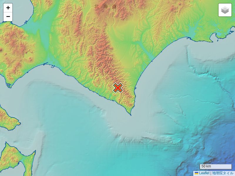 2025年12月23日 5:03ごろ日高地方東部(深さ約50km)を震源とする震度2の地震がありました。この地震による津波の心配はありません。