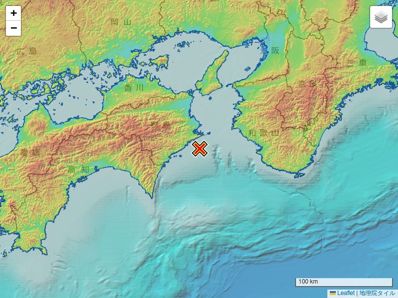 2026年1月2日 7:49ごろ紀伊水道(深さ約40km)を震源とする震度2の地震がありました。この地震による津波の心配はありません。