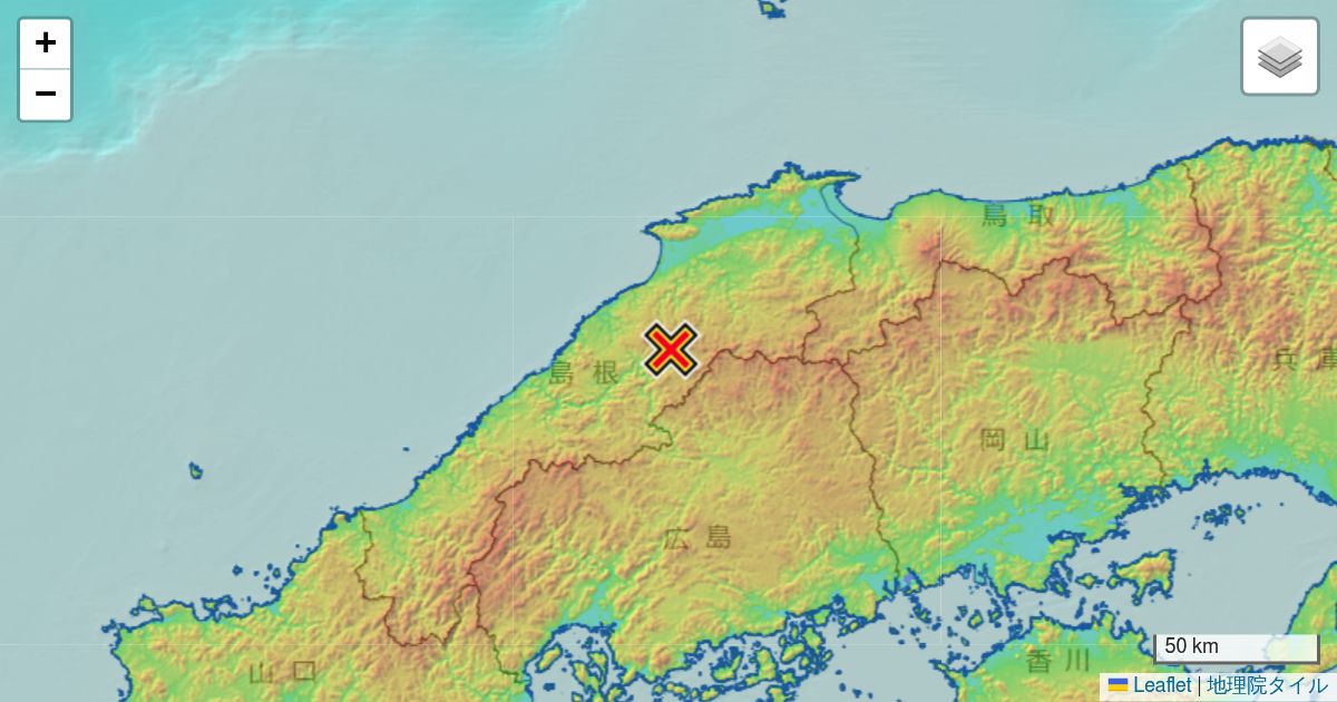 2026年4月12日 1:30ごろ島根県東部(深さ約10km)を震源とする震度2の地震がありました。この地震による津波の心配はありません。